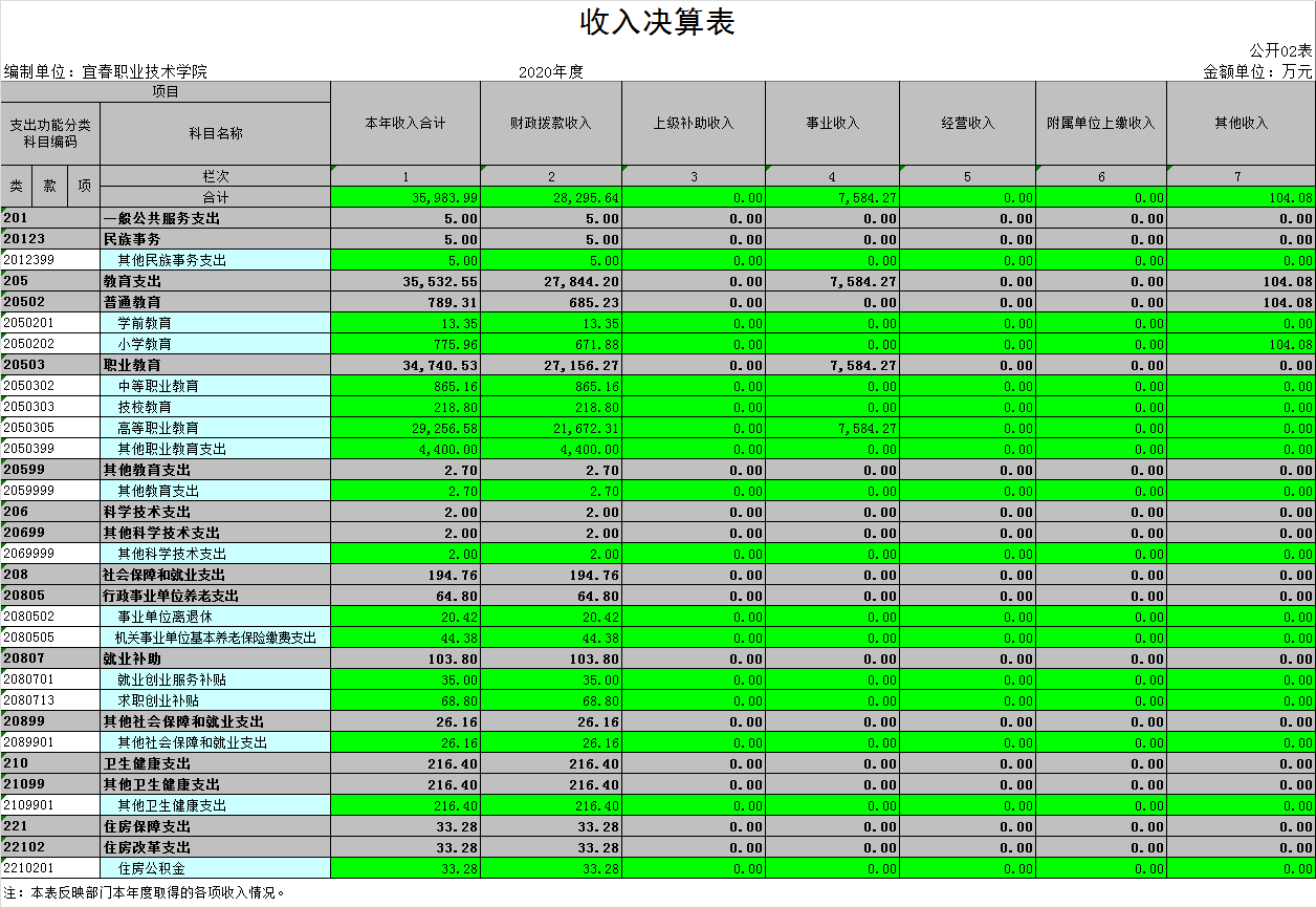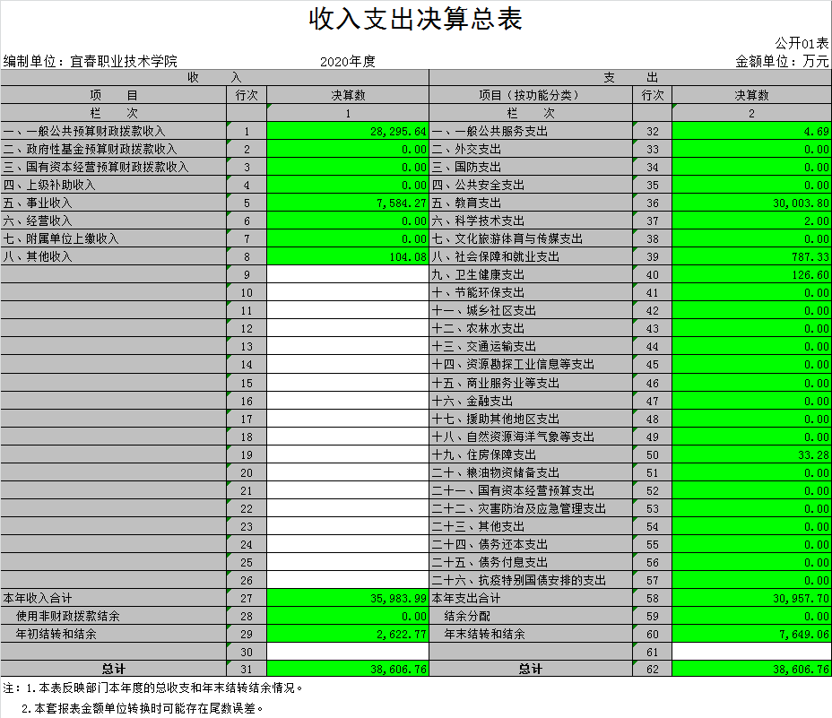 本部门2020年度收入总计38606.76万元,其中年初结转和结余2622.77万元,较2019年减少4703.81万元,下降10.86%;本年收入合计35983.99万元,较2019年增加314.61万元,增长0.88 %,主要原因是:学校生源结构调整,大专生人数增加。