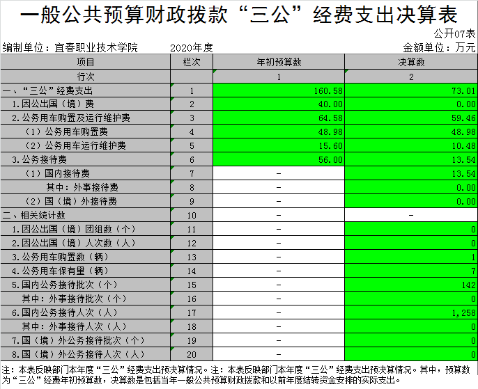 (九)“三公”经费:因公出国(境)费用反映单位公务出国(境)的国际旅费、国外城市间的交通费、住宿费、伙食费、培训费、公杂费等支出;公务接待费反映单位按规定开支的各类公务接待(含外宾接待)费用;公务用车运行维护费反映单位按规定保留的公务用车租用费、燃料费、维修费、过桥过路费、保险费、安全奖励费用等支出;公务用车购置反映单位公务用车车辆购置支出(含车辆购置税)。