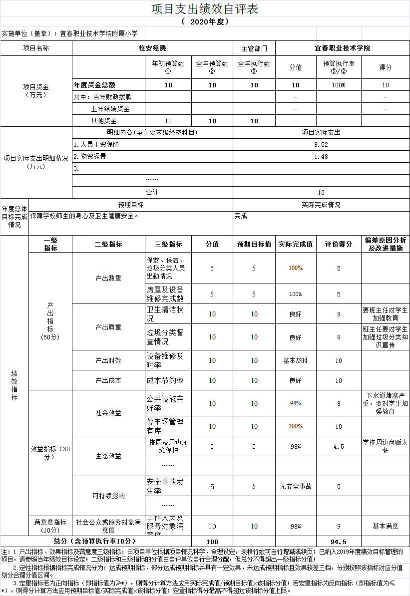 项目绩效自评总体综述:根据年初设定的绩效目标,“金年会附属小学校安经费”项目绩效自评得分为94.5分。项目全年预算数为10万元,详见附表。