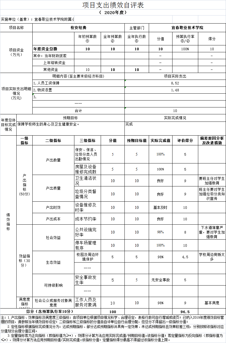 项目绩效自评总体综述:根据年初设定的绩效目标,校安经费项目绩效自评得分为94.5分。项目全年预算数为10万元,执行数为10万元,完成预算的100%。项目绩效目标完成情况:一是加强人员管理,保证校园卫生整洁,营造一个舒适的学习环境;二是保障学校师生安全,全年无安全事故发生。发现的问题及原因:一是评价指标体系还需进一步完善;二是人员配置要加强。下一步改进措施:一是进一步强化预算管理;二是加强业务培训,提高工作方法和成效。