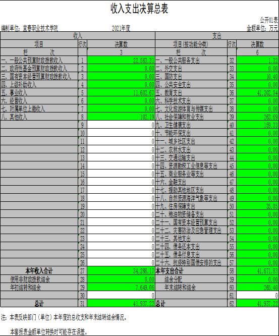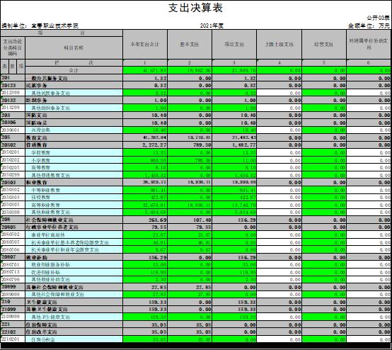 本部门2021年度支出总计41671.83万元,其中本年支出合计41671.83万元,较2020年增加10714.13万元,增长34.61%,主要原因是:新校区搬迁采购大量的教学设施设备,继续加大职业教育投入;年末结转和结余265.4万元,较2020年减少7383.66万元,下降96.53%,主要原因是:财政政策调整,零基预算,年末财政拨款收入未使用完的结余暂时收回。