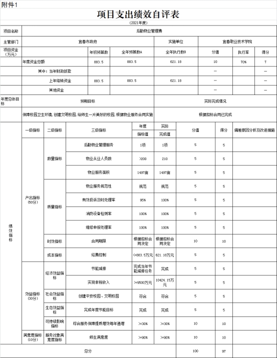 根据宜财绩【2022】2号文《宜春市财政局关于市级部门开展单位自评及部门评价工作的通知》,为了配合财政的加强财政资金管理的目的,切实提高资金使用效益,我校绩效评价小组成员经过综合考量,慎重选取了后勤物业管理费项目为代表进行部门绩效评价。