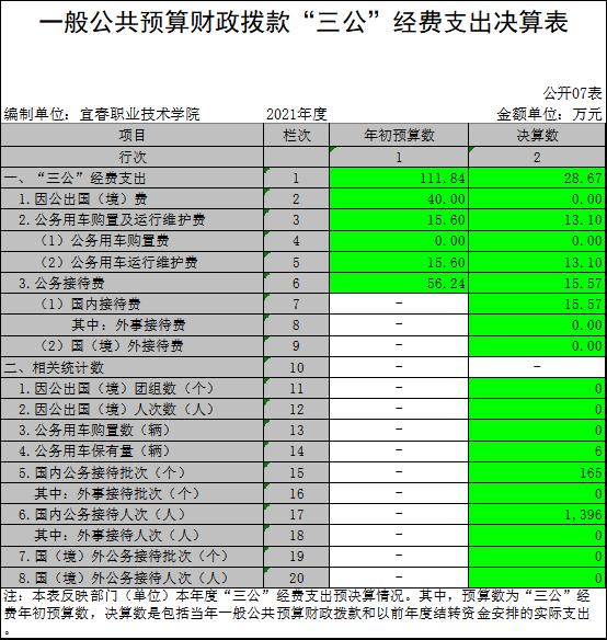 (九)“三公”经费:因公出国(境)费用反映单位公务出国(境)的国际旅费、国外城市间的交通费、住宿费、伙食费、培训费、公杂费等支出;公务接待费反映单位按规定开支的各类公务接待(含外宾接待)费用;公务用车运行维护费反映单位按规定保留的公务用车租用费、燃料费、维修费、过桥过路费、保险费、安全奖励费用等支出;公务用车购置反映单位公务用车车辆购置支出(含车辆购置税)。