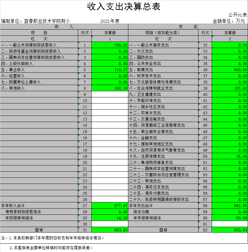 本单位2021年度支出总计942.94万元,其中本年支出合计942.94万元,较2020年(减少)5.1万元,(下降)0.01%,主要原因是:2021年新增一名退休教师;年末结转和结余50.88万元,较2020年增加34.53万元,增长211.19%,主要原因是:部分项目支出在2022年使用。