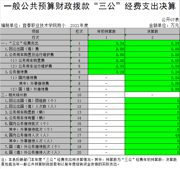 (二)公务接待费支出年初预算数为0.24万元,决算数为0.24万元,完成预算的100%,决算数较2020年增加(减少)0万元,增长(下降)0%,主要原因是无增减。决算数较年初预算数增加(减少)的主要原因是无增减。全年国内公务接待2批,累计接待48人次,其中外事接待0批,累计接待0人次,主要为:高安幼专附小交流学习。